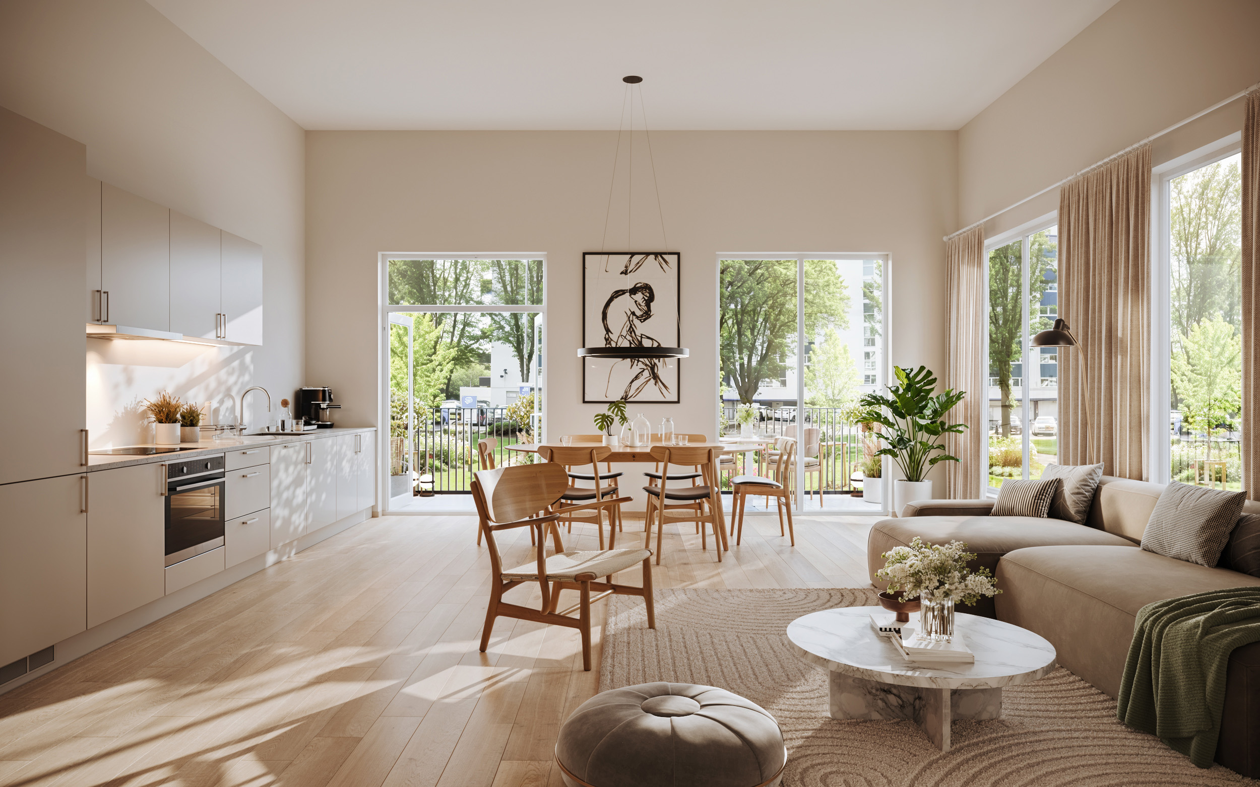 Alle 3D-illustrasjoner er kun ment å gi inntrykk av en ferdig bebyggelse og utendørsareal, og er ikke bindende for utformingen av endelig bebyggelse og utendørsareal. Avvik kan forekomme. Det kan inneholde elementer som ikke inngår i utbyggers leveranse, både når det gjelder utvendige forhold og innredning. All informasjon er derfor gitt med forbehold om rett for utbygger til å foreta endringer.
